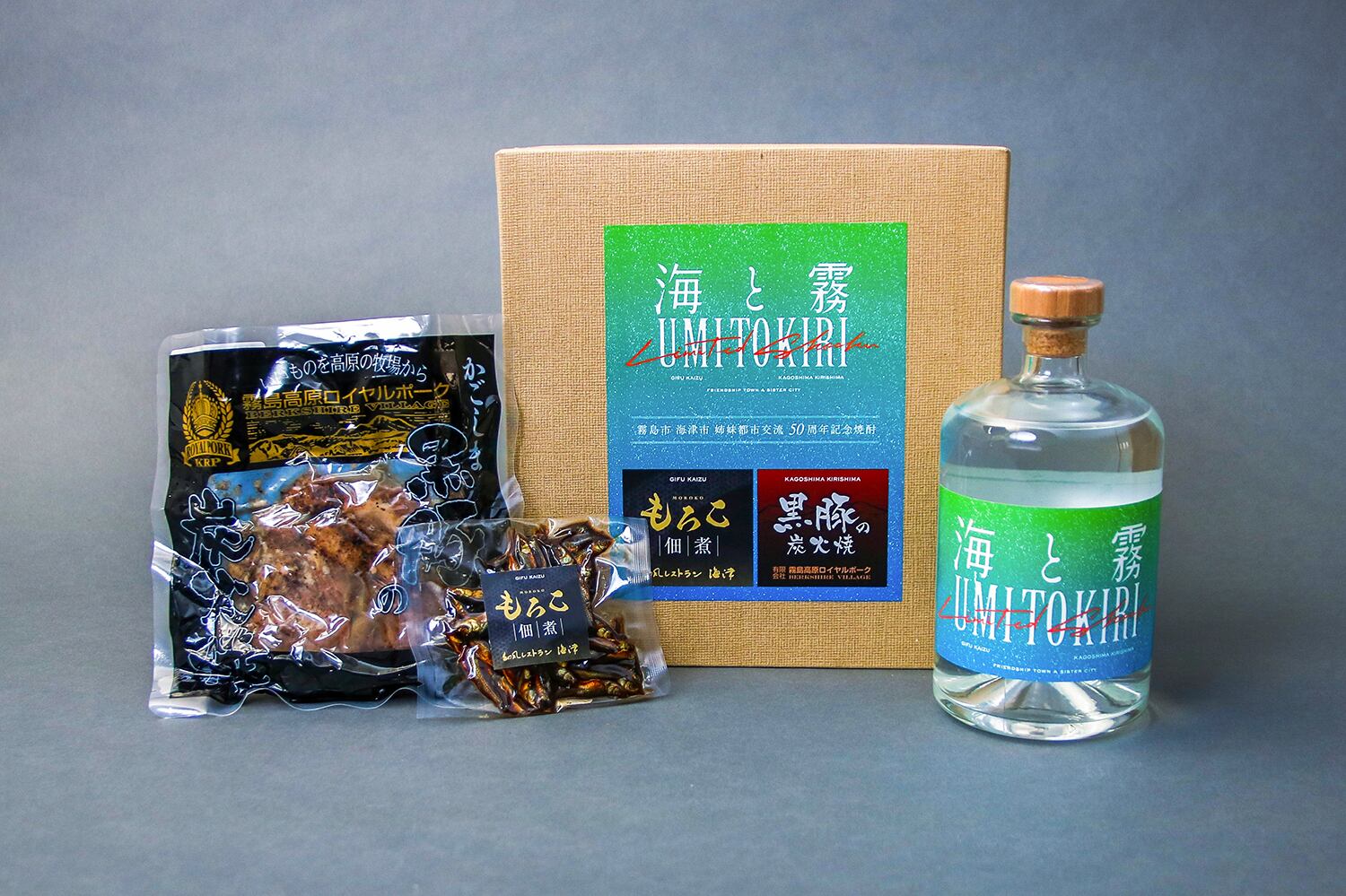 この度、この「海と霧」に、海津の名産である「もろこの佃煮」と霧島の大自然で育てられた「黒豚の炭火焼」をセットにしましたので、是非ご一緒にご賞味いただき、海津市と霧島市の歴史と風情を感じていただければ幸甚です。